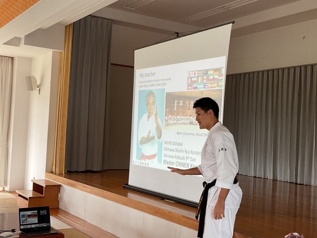 体験の前半では、空手の歴史や精神性についての座学を行い、